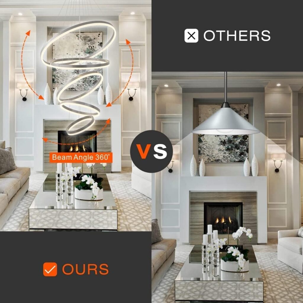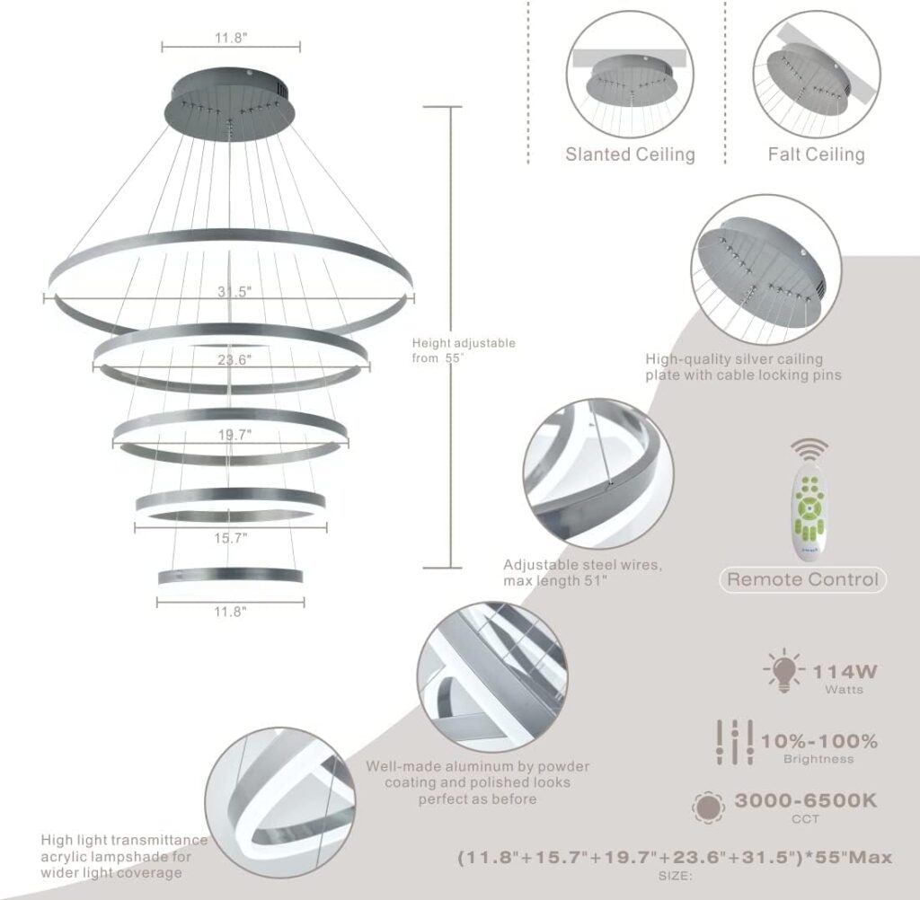 - 【No Risk Purchase Modern LED Chandelier 5 Rings Chandelier】 30 days free exchange and return on this modern led chandelier,5 rings chandelier,led pendant light,modern chandelier for dinging room, and also 3 year warranty (can send broken accessories or partially refund). We have our own factory and a professional engineer team; if you have any question on this high ceiling chandelier, ring chandelier light fixture with remote control,please contact us anytime,we are together.
