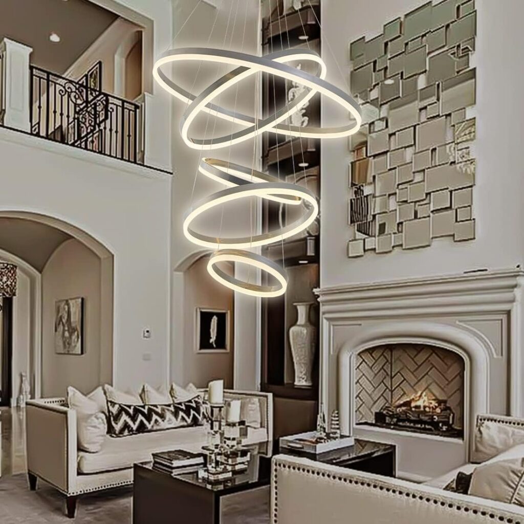 - 【High Ceiling Chandelier for Dining Room】This dining room modern led chandelier lighting fixture is designed in a modern shape with 5 rings chandelier and adjustable height.The simple led pendant light will add more elegant and luxurious elements to your house. Normally, sloped and vaulted ceilings ae angled which affects how a chandelier hangs, but never worry, this 5 ring chandelier can easily work with both of them. Recommended for high ceiling foyer,staircase and entry-way;