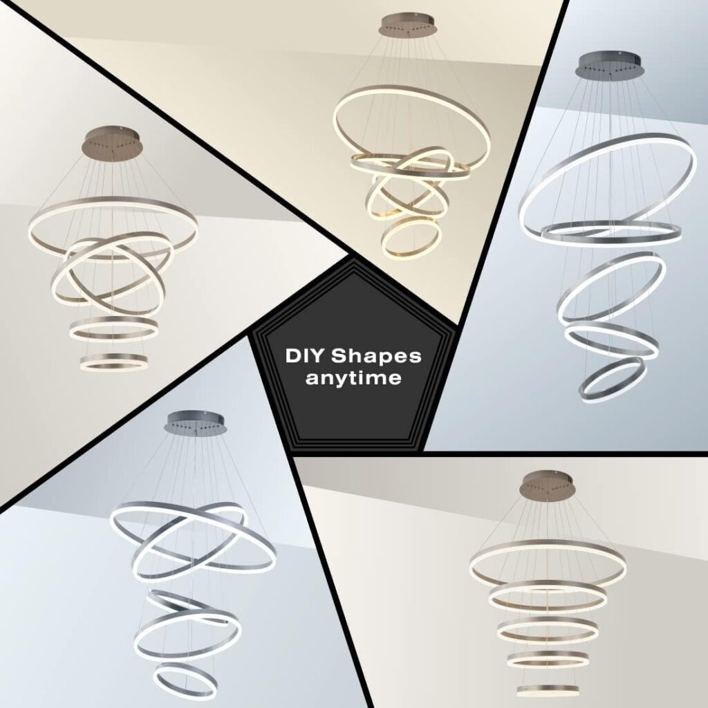 - 【Multiple Shapes Led Chandelier,5 Rings Modern Chandelier】Choosing a modern chandelier is not as easy as you think. They not only illuminate a space, they also add a nice decorative touch. To achieve these purposes,you need a multiple shapes supported ring chandelier. Hihihomy 5 rings chandelier it is , you will get several style by adjusting the strings via cable locking pins; DIY and choosing your favorite shape before install ;Which keep your chandelier light fixtures decor never out of date;