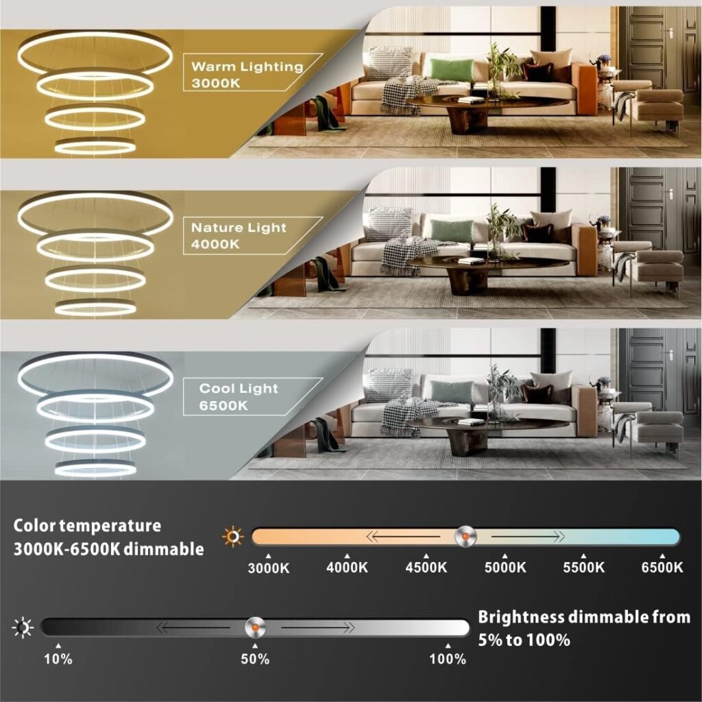 - 【Stepless Dimmable Big Modern LED Chandelier】Your modern chandelier should match the overall theme of the space. Complement a chic foyer/enterway by placing a big 5 Rings Chandelier. HiHIHOMY modern led chandelier is dimmable, the color temperature of the led chandelier light fixture can be controlled remotely. There are three light modes :warm light, natural light, white light,The modern big chandelier for high ceilings has built-in led lights, which is with long service life over 50000 working hrs;