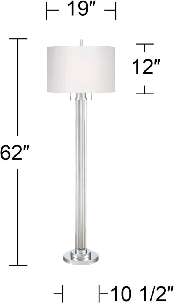 - UL listed. 62″ high overall. Base is 10 1/2″ wide. Drum shade is 19″ wide x 12″ high. Weighs 35 lbs.