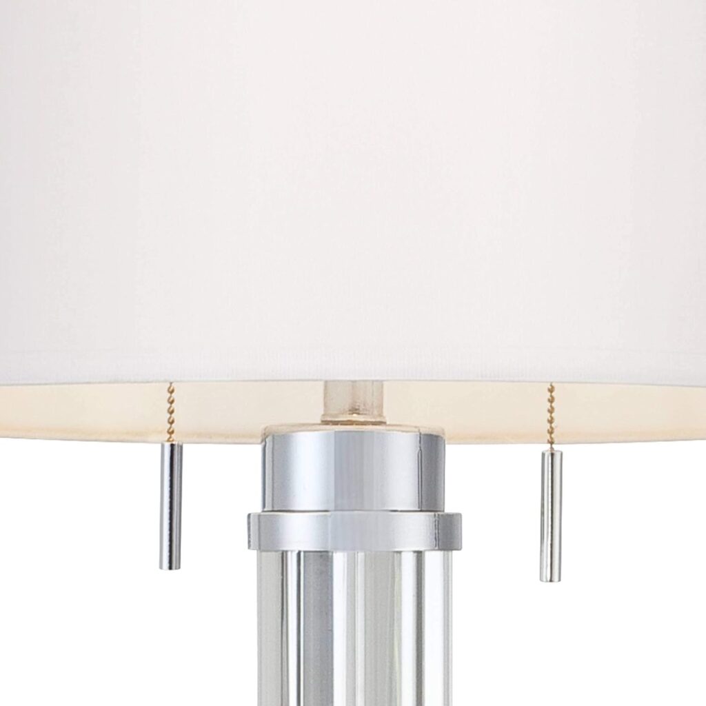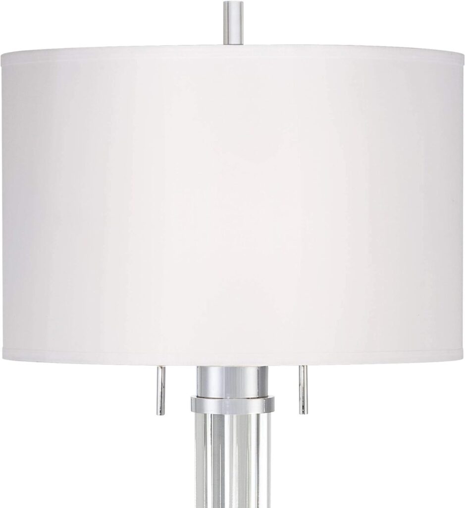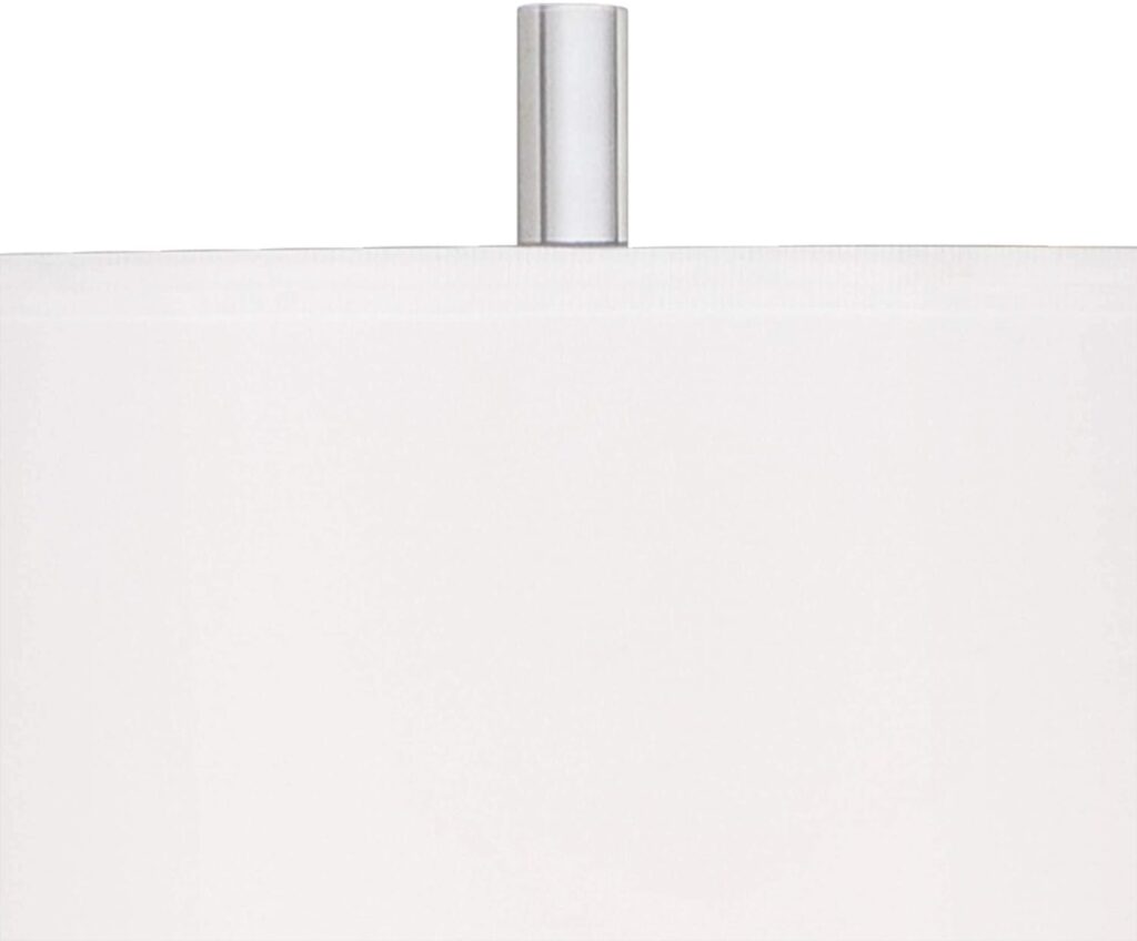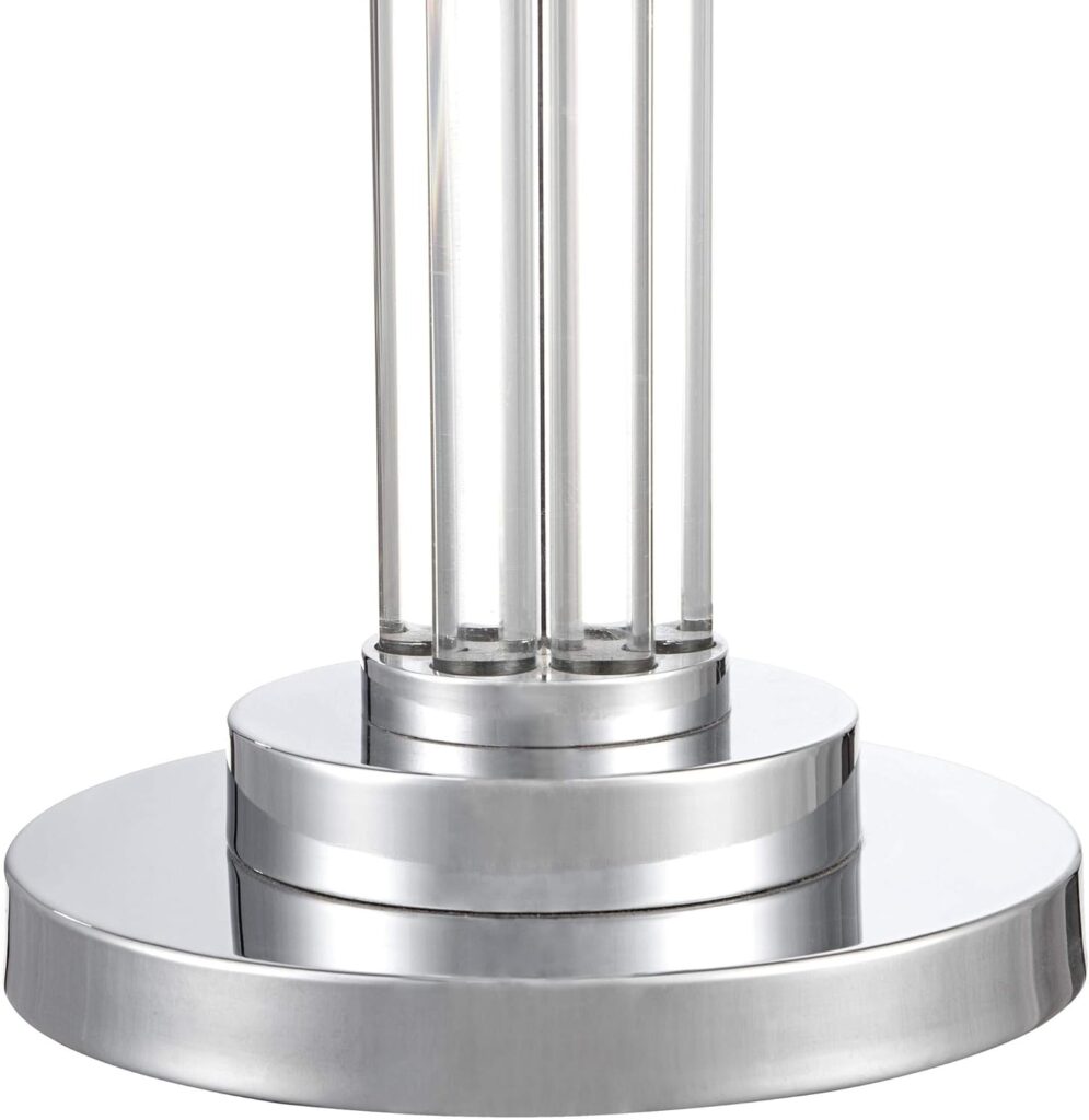 This “glam style” floor lamp is beautiful in an understated way. It doesn’t stand up and shout, “I am here”, but it is noticed by people who come into my home. Sturdy, solid and heavy. It is not brushed nickel as mentioned above. It is shiny like chrome so it won’t eventually turn gray or green.